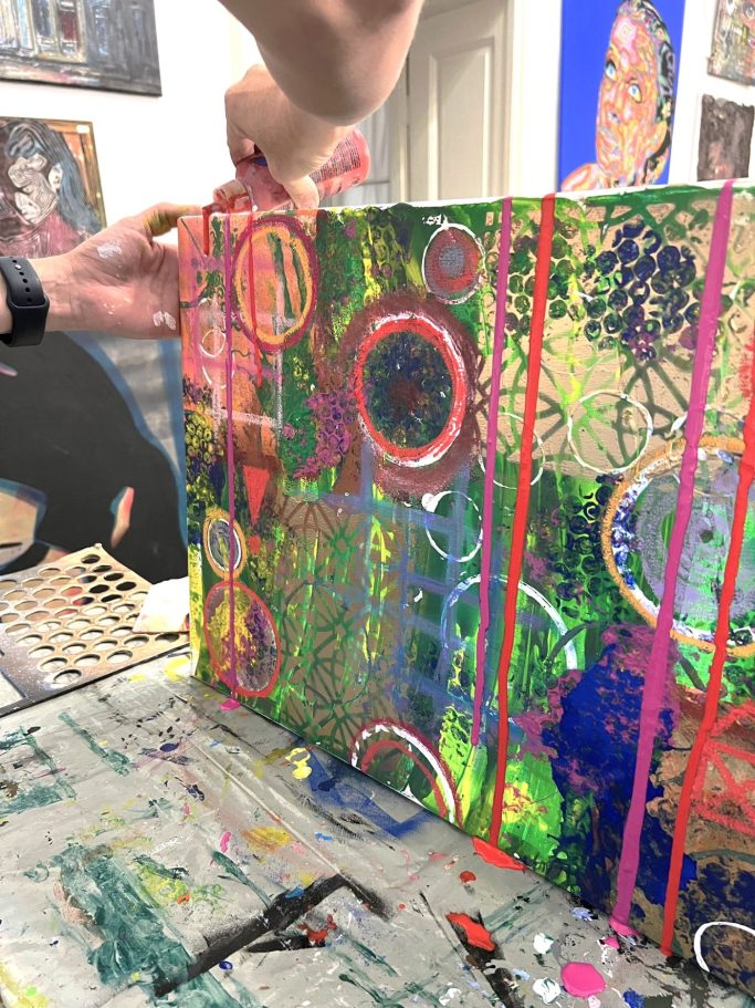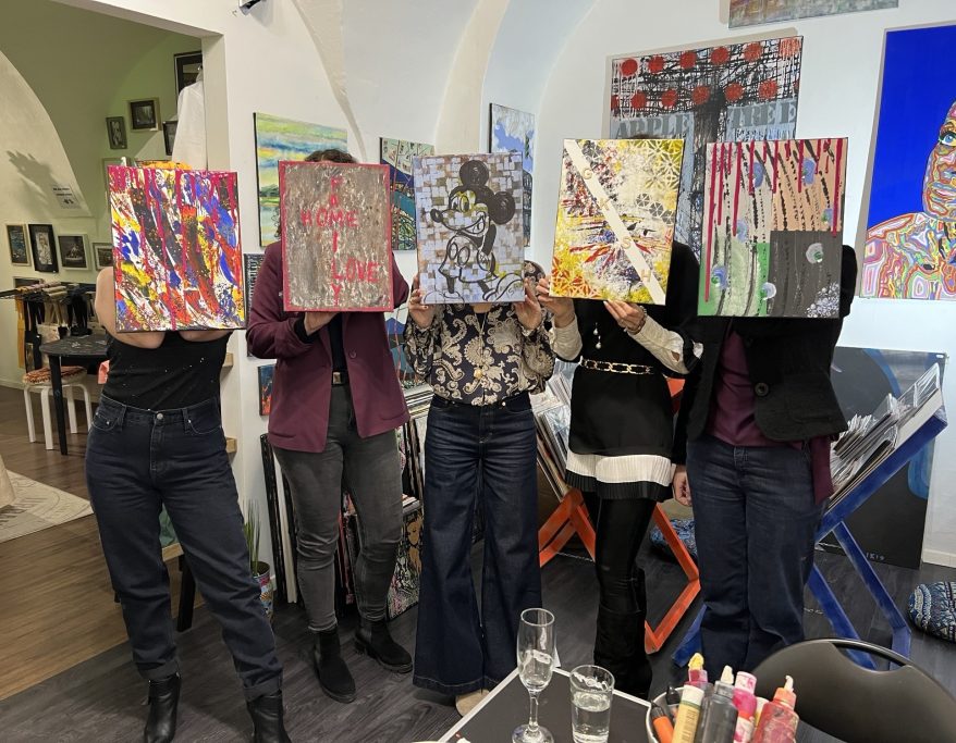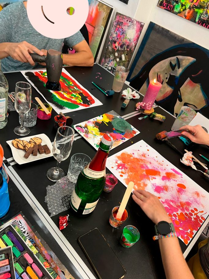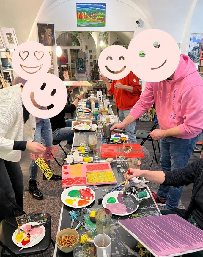 Die Teilnehmer*innen können entweder an einer eigenen Leinwand arbeiten oder gemeinsam ein großes Gemeinschaftsbild gestalten – ein besonderes Erlebnis, das verbindet und bleibende Erinnerungen schafft.