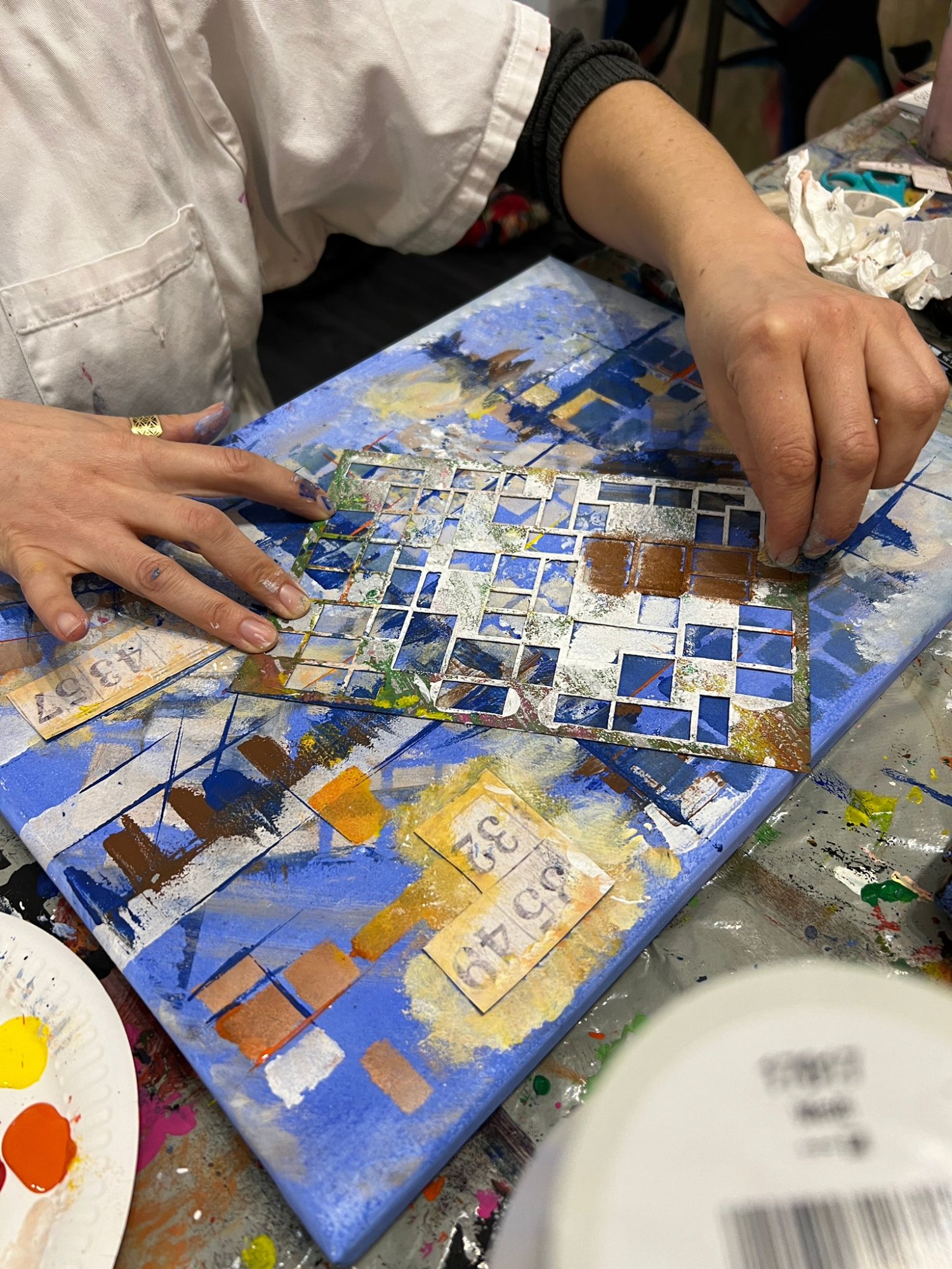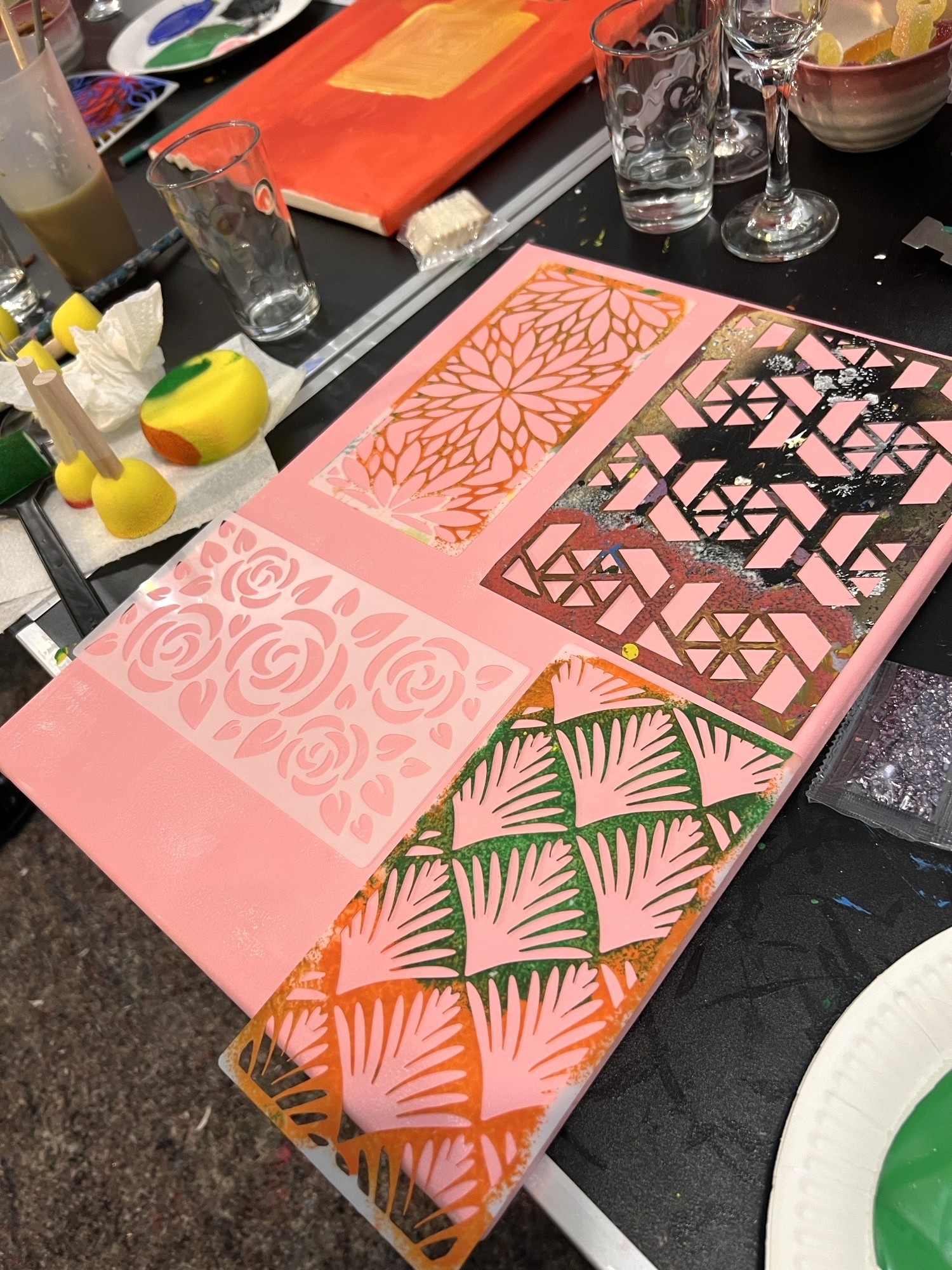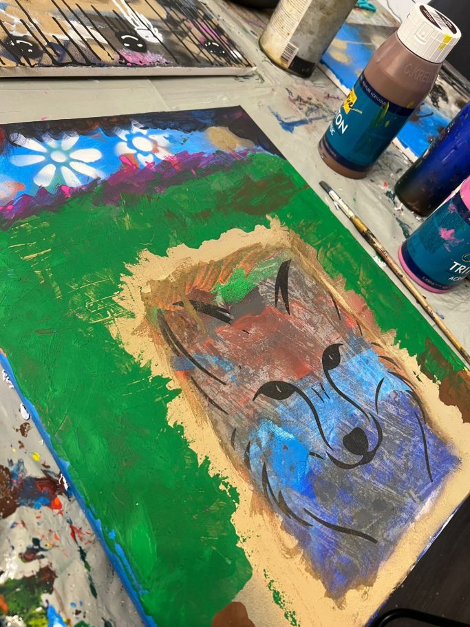 Dabei dürfen sie nach Herzenslust experimentieren: mit Acrylfarben, Kreiden, Sprühfarben und Schablonen entstehen bunte Formen, spannende Strukturen und ein einzigartiges Bild als bleibende Erinnerung.